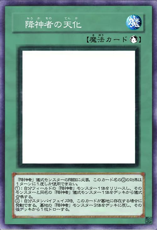 フィールドの降神者をリリースしてデッキから同名モンスターを儀式召喚する特殊な儀式魔法です。降神者が直接召喚できるため、そこから儀式を行うことができます。また使用した後は、毎ターン墓地の降神者をデッキに戻すことでドローができます。墓地から蘇生した方がいい降神者もいるので使用は計画的に。」(2018-08-03 10:43)