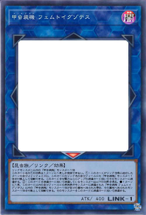 | リンクモンスター以外の「甲虫装機」モンスター1体 このカード名の①の効果は1ターンに1度しか使用できない。①:このカードがリンク召喚に成功したターンの自分メインフェイズに、このカードのリンク先の自分フィールドの「甲虫装機」モンスター1体を対象として発動できる。このカードを攻撃力400アップの装備カード扱いでそのモンスターに装備する。②:このカードを装備カード扱いで装備しているモンスターは以下の効果を得る。●1ターンに1度、このカード以外の自分フィールドの表側表示モンスターに装備された「甲虫装機 フェムトイグゾデス」以外の「甲虫装機」モンスター1体が自分の墓地へ送られた場合、その墓地へ送られたモンスター1体を対象として発動できる。そのモンスターをこのカードに装備カード扱いで装備する。 | |||