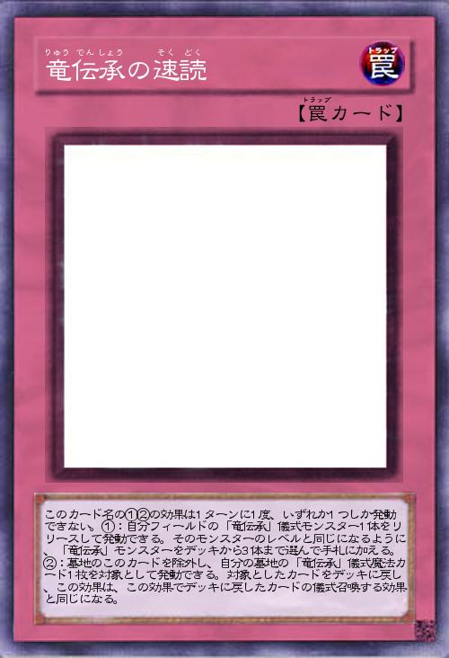 | このカード名の①②の効果は1ターンに1度、いずれか1つしか発動できない。①:自分フィールドの「竜伝承」儀式モンスター1体をリリースして発動できる。そのモンスターのレベルと同じになるように、「竜伝承」モンスターをデッキから3体まで選んで手札に加える。②:墓地のこのカードを除外し、自分の墓地の「竜伝承」儀式魔法カード1枚を対象として発動できる。対象としたカードをデッキに戻し、この効果は、この効果でデッキに戻したカードの儀式召喚する効果と同じになる。 | |||