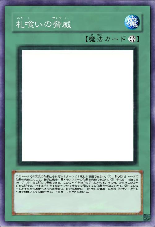 | このカード名の②③の効果はそれぞれ1ターンに1度しか使用できない。①:「札喰い」カードの効果の発動に対して、相手は魔法・罠・モンスターの効果を発動できない。②:手札を1枚捨てるか、手札を1枚公開して発動できる。このカードを相手の手札に加える。その後、加えたこのカードを公開する。相手は手札を1枚ターン終了時まで公開してこの効果を無効にできる。③:このカードが手札から墓地へ送られた場合に、自分の墓地の、「札喰いの脅威」以外の「札喰い」カード1枚を対象として発動できる。そのカードを手札に加える。 | |||