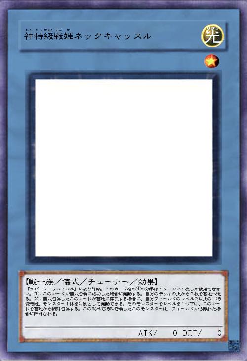 | 「ラピート・リバイバル」により降臨。このカード名の①の効果は1ターンに1度しか使用できない。①:このカードが儀式召喚に成功した場合に発動する。自分のデッキの上から3枚を墓地へ送る。②:儀式召喚したこのカードが墓地に存在する場合に、自分フィールドのレベル2以上の「特級戦姫」モンスター1体を対象として発動できる。そのモンスターをレベルを1つ下げ、このカードを墓地から特殊召喚する。この効果で特殊召喚したこのモンスターは、フィールドから離れた場合に除外される。 | |||
