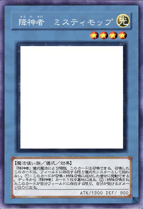 | 「降神者」儀式魔法により降臨。このカードは召喚できる。召喚したこのカードは、フィールドに存在する限り儀式モンスターとして扱わない。①:このカードが召喚・特殊召喚に成功した場合に発動できる。デッキから「降神者」カード1枚を墓地に送る。②:特殊召喚されたこのカードが自分フィールドに存在する限り、自分が受けるダメージは0になる。 | |||