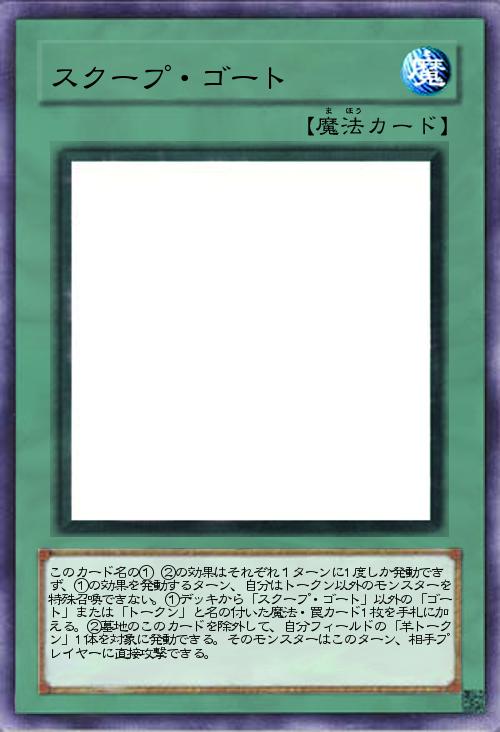 | このカード名の① ②の効果はそれぞれ1ターンに1度しか発動できず、①の効果を発動するターン、自分はトークン以外のモンスターを特殊召喚できない。①デッキから「スクープ・ゴート」以外の「ゴート」または「トークン」と名の付いた魔法・罠カード1枚を手札に加える。②墓地のこのカードを除外して、自分フィールドの「羊トークン」1体を対象に発動できる。そのモンスターはこのターン、相手プレイヤーに直接攻撃できる。 | |||