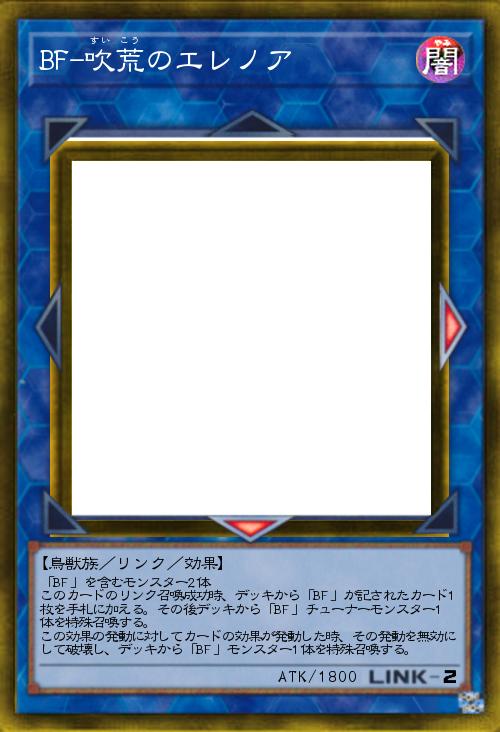 | 「BF」を含むモンスター2体 このカードのリンク召喚成功時、デッキから「BF」が記されたカード1枚を手札に加える。その後デッキから「BF」チューナーモンスター1体を特殊召喚する。 この効果の発動に対してカードの効果が発動した時、その発動を無効にして破壊し、デッキから「BF」モンスター1体を特殊召喚する。 | |||
