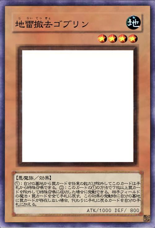 地雷を撤去してくれるゴブリン。墓地から罠を任意の数除外することでSSすることができ、7枚以上除外して呼び出した場合には相手の魔法・罠を全バウンスできる効果。加えて、墓地に罠がない場合にはそのバウンス先を自分の手札にできるという追加効果。