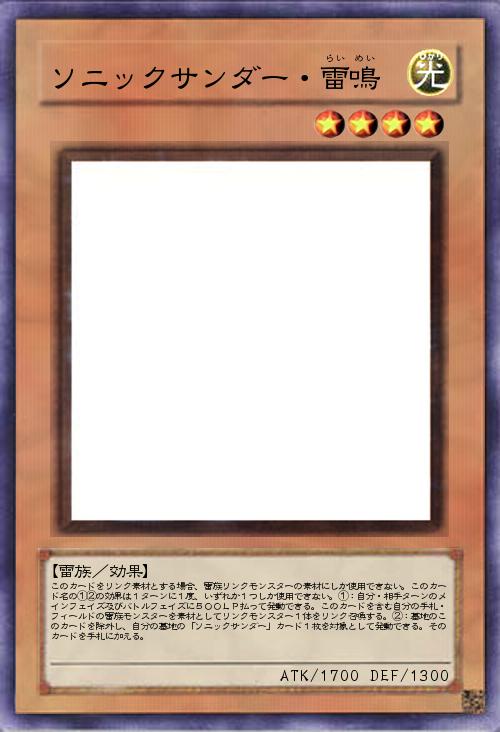 | このカードをリンク素材とする場合、雷族リンクモンスターの素材にしか使用できない。このカード名の①②の効果は1ターンに1度、いずれか1つしか使用できない。①:自分・相手ターンのメインフェイズ及びバトルフェイズに500LP払って発動できる。このカードを含む自分の手札・フィールドの雷族モンスターを素材としてリンクモンスター1体をリンク召喚する。②:墓地のこのカードを除外し、自分の墓地の「ソニックサンダー」カード1枚を対象として発動できる。そのカードを手札に加える。 | |||