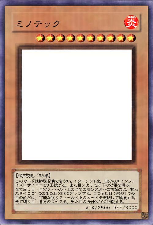 | このカードは特殊召喚できない。1ターンに1度、自分のメインフェイズにサイコロを3回投げる。出た目によって以下の効果を得る。 全て同じ目:自分フィールド上の全てのモンスターの攻撃力は、振ったサイコロ1つの出た目×500アップする。2つ同じ目:残り1つの目の数だけ、可能な限りフィールド上のカードを選択して破壊する。全て違う目:自分のライフを、出た目の合計×300回復する。 | |||