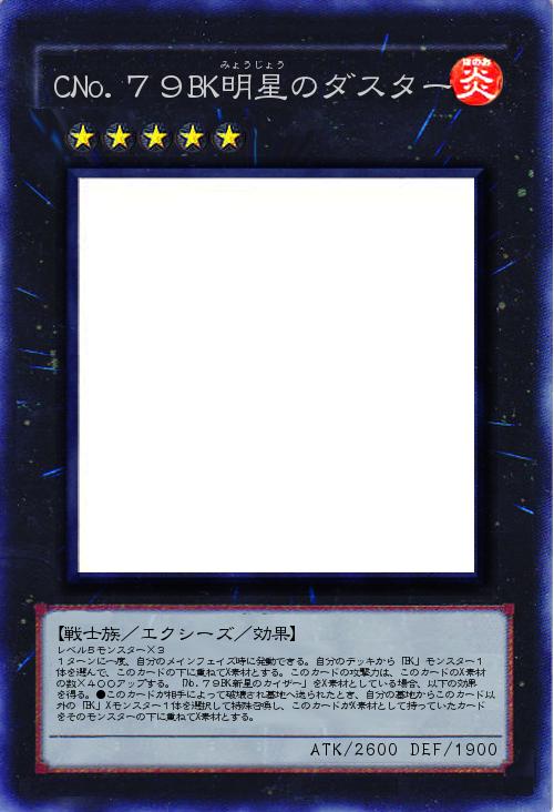 | レベル5モンスター×3 1ターンに一度、自分のメインフェイズ時に発動できる。自分のデッキから「BK」モンスター1体を選んで、このカードの下に重ねてX素材とする。このカードの攻撃力は、このカードのX素材の数×400アップする。「No.79BK新星のカイザー」をX素材としている場合、以下の効果を得る。●このカードが相手によって破壊され墓地へ送られたとき、自分の墓地からこのカード以外の「BK」Xモンスター1体を選択して特殊召喚し、このカードがX素材として持っていたカードをそのモンスターの下に重ねてX素材とする。 | |||