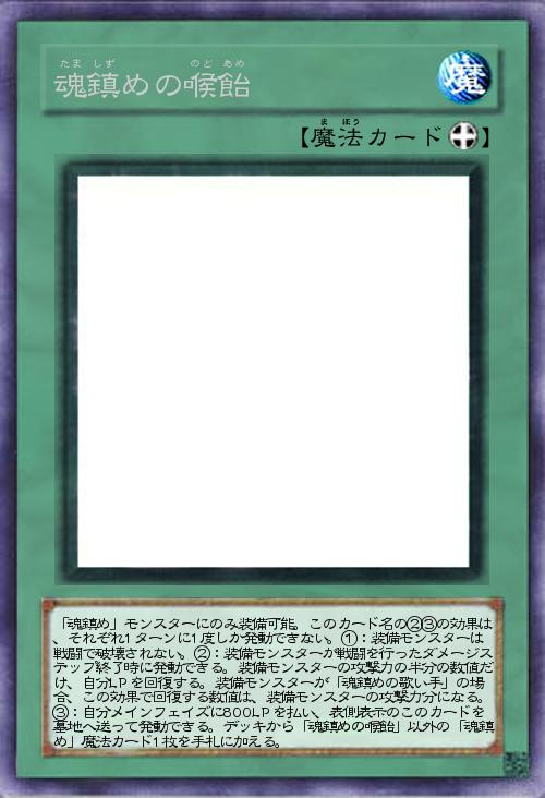 | 「魂鎮め」モンスターにのみ装備可能。このカード名の②③の効果は、それぞれ1ターンに1度しか発動できない。①:装備モンスターは戦闘で破壊されない。②:装備モンスターが戦闘を行ったダメージステップ終了時に発動できる。装備モンスターの攻撃力の半分の数値だけ、自分LPを回復する。装備モンスターが「魂鎮めの歌い手」の場合、この効果で回復する数値は、装備モンスターの攻撃力分になる。③:自分メインフェイズに800LPを払い、表側表示のこのカードを墓地へ送って発動できる。デッキから「魂鎮めの喉飴」以外の「魂鎮め」魔法カード1枚を手札に加える。 | |||