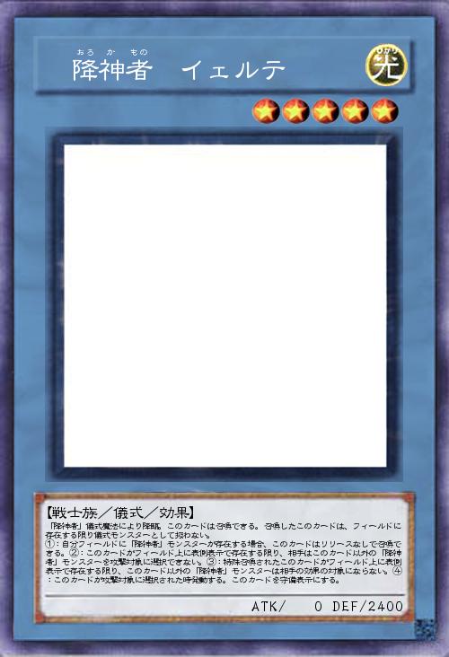 | 「降神者」儀式魔法により降臨。このカードは召喚できる。召喚したこのカードは、フィールドに存在する限り儀式モンスターとして扱わない。 ①:自分フィールドに「降神者」モンスターが存在する場合、このカードはリリースなしで召喚できる。②:このカードがフィールド上に表側表示で存在する限り、相手はこのカード以外の「降神者」モンスターを攻撃対象に選択できない。③:特殊召喚されたこのカードがフィールド上に表側表示で存在する限り、このカード以外の「降神者」モンスターは相手の効果の対象にならない。④:このカードが攻撃対象に選択された時発動する。このカードを守備表示にする。 | |||