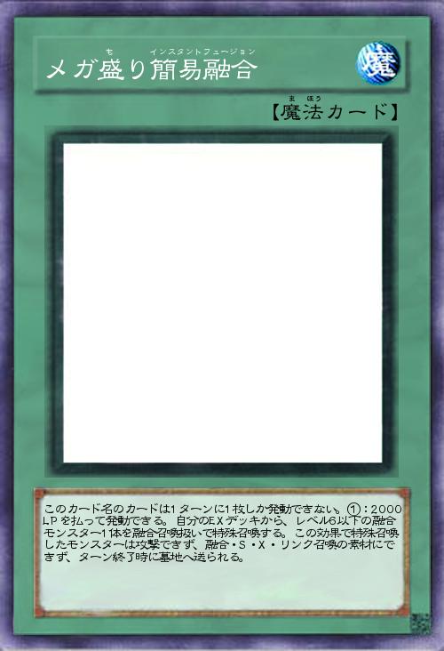 | このカード名のカードは1ターンに1枚しか発動できない。①:2000LPを払って発動できる。自分のEXデッキから、レベル6以下の融合モンスター1体を融合召喚扱いで特殊召喚する。この効果で特殊召喚したモンスターは攻撃できず、融合・S・X・リンク召喚の素材にできず、ターン終了時に墓地へ送られる。 | |||