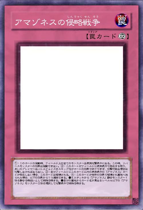 | ①:このカードの発動時、フィールド上の全てのモンスターは表側攻撃表示になる。この時、リバースモンスターの効果は発動できない。②:このカードがフィールドに表側表示で存在する限り、互いのプレイヤーはバトルフェイズをスキップ及びカードの効果で終了できず、攻撃可能な場合は攻撃しなければならない。③:自分フィールドにこのカード以外の表側表示の「アマゾネス」カードが存在しない場合、このカードは破壊される。④:このカードが相手の効果で破壊され墓地へ送られた場合、以下の効果から1つ適用できる。●EXデッキから「アマゾネス」融合モンスター1体を融合召喚扱いとして特殊召喚する。●自分の墓地からカード名が異なるレベル4以下の「アマゾネス」モンスター2体を選択して攻撃表示で特殊召喚する。 | |||