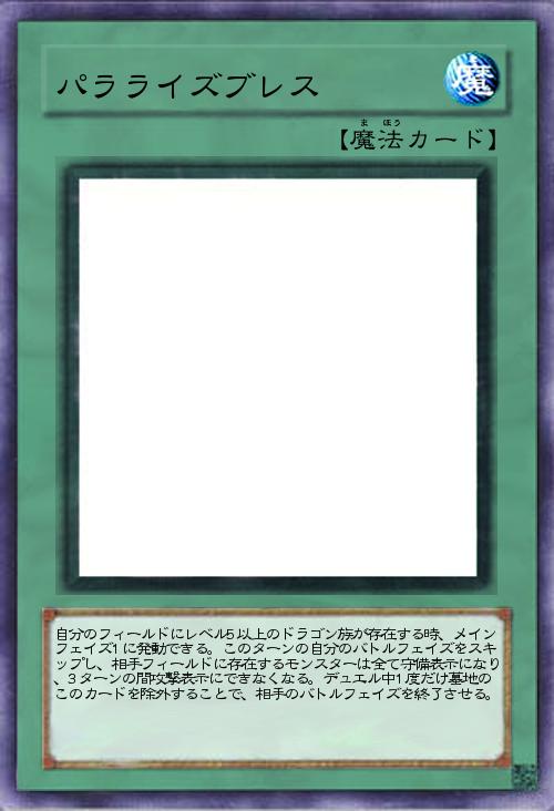 | 自分のフィールドにレベル5以上のドラゴン族が存在する時、メインフェイズ1に発動できる。このターンの自分のバトルフェイズをスキップし、相手フィールドに存在するモンスターは全て守備表示になり、3ターンの間攻撃表示にできなくなる。デュエル中1度だけ墓地のこのカードを除外することで、相手のバトルフェイズを終了させる。 | |||