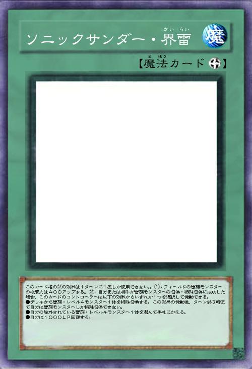 | このカード名の②の効果は1ターンに1度しか使用できない,。①:フィールドの雷族モンスターの攻撃力は400アップする。②:自分または相手が雷族モンスターの召喚・特殊召喚に成功した場合、このカードのコントローラーは以下の効果からいずれか1つを選択して発動できる。 ●デッキから雷族・レベル4モンスター1体を特殊召喚する。この効果の発動後、ターン終了時まで自分は雷族モンスターしか特殊召喚できない。 ●自分の除外されている雷族・レベル4モンスター1体を選んで手札に加える。 ●自分は1000LP回復する。 | |||