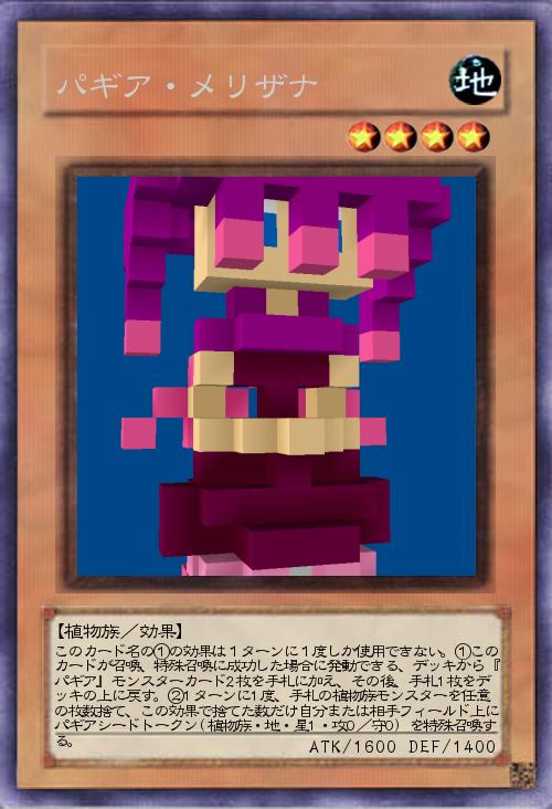 | このカード名の①の効果は1ターンに1度しか使用できない。①このカードが召喚、特殊召喚に成功した場合に発動できる、デッキから『パギア』モンスターカード2枚を手札に加え、その後、手札1枚をデッキの上に戻す。②1ターンに1度、手札の植物族モンスターを任意の枚数捨て、この効果で捨てた数だけ自分または相手フィールド上にパギアシードトークン(植物族・地・星1・攻0/守0)を特殊召喚する。 | |||