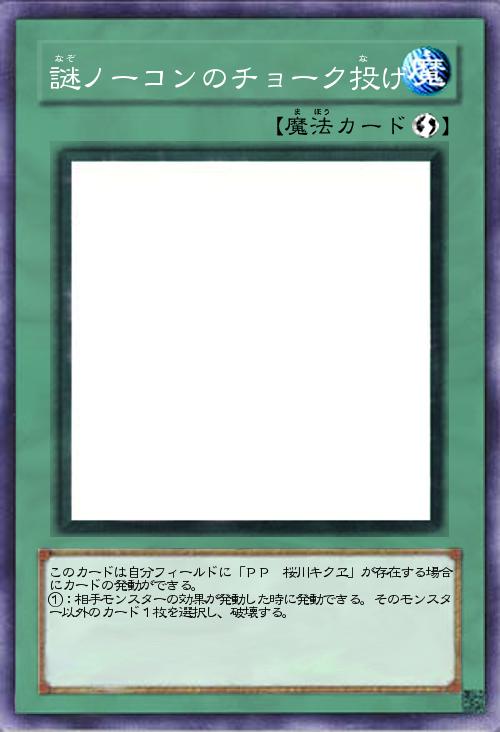 | このカードは自分フィールドに「PP 桜川キクヱ」が存在する場合にカードの発動ができる。 ①:相手モンスターの効果が発動した時に発動できる。そのモンスター以外のカード1枚を選択し、破壊する。 | |||