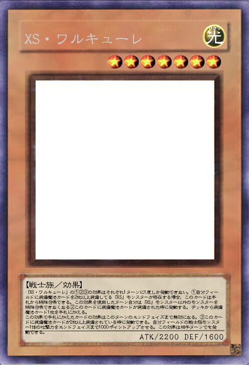 | 「XS・ワルキューレ」の①②③の効果はそれぞれ1ターンに1度しか発動できない。①自分フィールドに装備魔法カードを2枚以上装備してる「XS」モンスターが存在する場合、このカードは手札から特殊召喚できる。この効果を使用したターン自分は「XS」モンスター以外のモンスターを特殊召喚できなくなる②このカードに装備魔法カードが装備された時に発動する。デッキから装備魔法カード1枚を手札に加える。 この効果で手札に加えたカードの効果はこのターンのエンドフェイズまで無効になる。③このカードに装備魔法カードが2枚以上装備されている時に発動できる。自分フィールドの戦士族モンスター1体の攻撃力をエンドフェイズまで1000ポイントアップさせる。この効果は相手ターンでも発動できる。 | |||