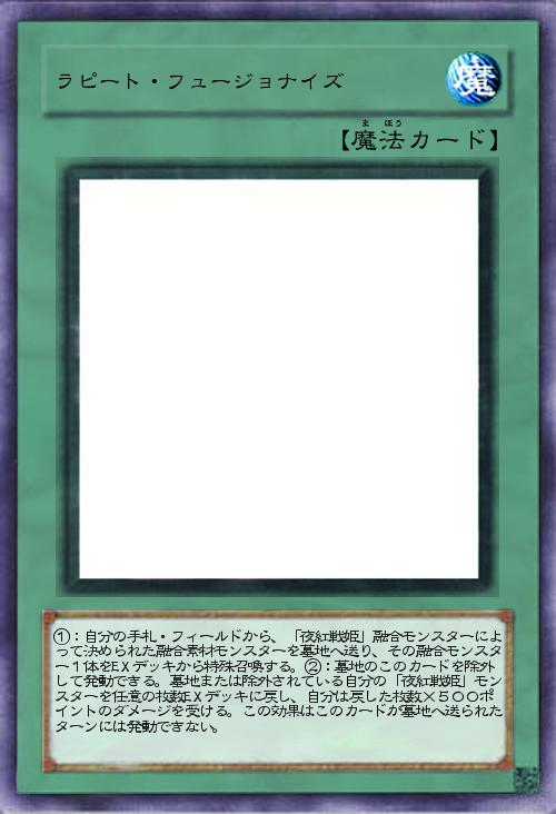 「今回は「夜紅戦姫」融合モンスター専用の融合魔法。みんな大好きオフリスコブラとか竜魔導の守護者とかでサーチされないよう「フュージョン」じゃなくて「フュージョナイズ」と名づけました。まあ「夜紅戦姫」で汎用融合モンスターができるかはまた別の問題ですがね。」(2018-08-12 18:29)
