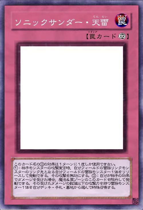 | このカード名の②の効果は1ターンに1度しか使用できない。 ①:相手モンスターの攻撃宣言時、自分フィールドの雷族リンクモンスターのリンク先となる自分フィールドの雷族モンスター1体をリリースして発動できる。その攻撃を無効にする。②:自分が相手の効果でダメージを受けた場合、魔法&罠ゾーンのこのカードを除外して発動できる。その受けたダメージの数値以下の攻撃力を持つ雷族モンスター1体を自分デッキ・手札・墓地から選んで特殊召喚する。 | |||