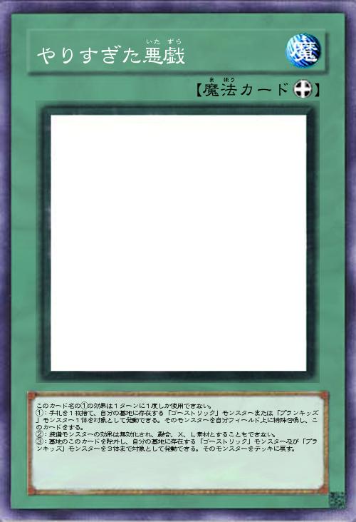 | このカード名の①の効果は1ターンに1度しか使用できない。 ①:手札を1枚捨て、自分の墓地に存在する「ゴーストリック」モンスターまたは「プランキッズ」モンスター1体を対象として発動できる。そのモンスターを自分フィールド上に特殊召喚し、このカードをする。 ②:装備モンスターの効果は無効化され、融合、X、L素材とすることもできない。 ③:墓地のこのカードを除外し、自分の墓地に存在する「ゴーストリック」モンスター及び「プランキッズ」モンスターを3体まで対象として発動できる。そのモンスターをデッキに戻す。 | |||