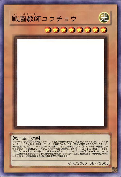 | このカード名の①③の効果は1ターンに1度しか発動できない。①自分フィールド上の「バトルティーチャー」モンスター2体をリリースして発動できる。手札・墓地に存在するこのモンスターを特殊召喚する。②このカードはカードの効果によっては破壊されない。③このカードが戦闘によってモンスターを破壊したバトルフェイズ終了時に発動する。自分フィールド上に「生徒トークン」(戦士族・地・星4・攻/守?)1体を特殊召喚する。このトークンの攻撃力・守備力はこのターンに破壊されたモンスターの中で最も攻撃力の高いモンスターと同じ数値になる(最も攻撃力の高いモンスターが複数存在する場合は1体を選んで適用する)。 | |||
