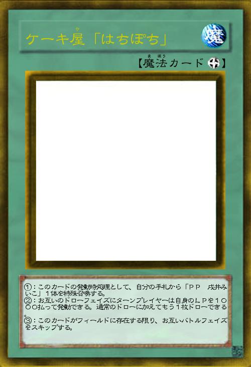 | ①:このカードの発動時処理として、自分の手札から「PP 戌井みいこ」1体を特殊召喚する。 ②:お互いのドローフェイズにターンプレイヤーは自身のLPを1000払って発動できる。通常のドローに加えてもう1枚ドローできる。 ③:このカードがフィールドに存在する限り、お互いバトルフェイズをスキップする。 | |||