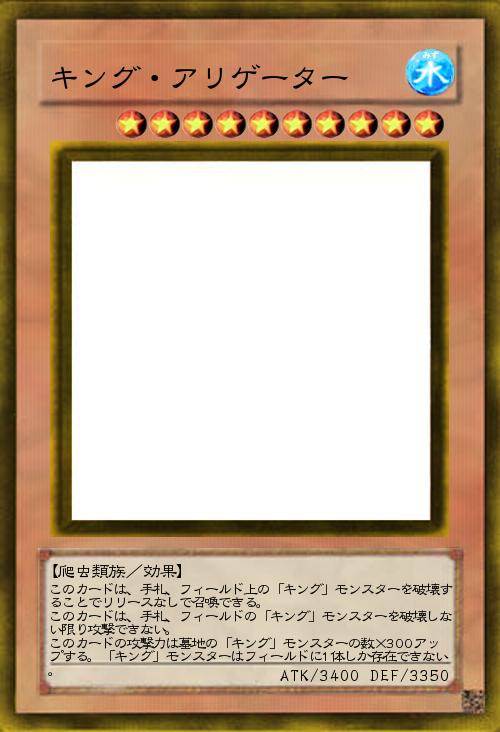 | このカードは、手札、フィールド上の「キング」モンスターを破壊することでリリースなしで召喚できる。 このカードは、手札、フィールドの「キング」モンスターを破壊しない限り攻撃できない。 このカードの攻撃力は墓地の「キング」モンスターの数×300アップする。「キング」モンスターはフィールドに1体しか存在できない。 | |||
