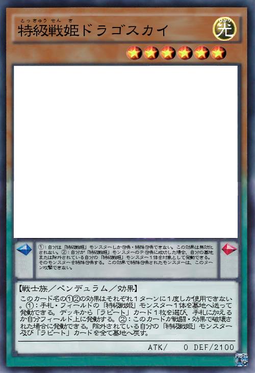 | このカード名の①②の効果はそれぞれ1ターンに1度しか使用できない。①:手札・フィールドの「特級戦姫」モンスター1体を墓地へ送って発動できる。デッキから「ラピート」カード1枚を選び、手札に加えるか自分フィールド上に発動する。②:このカードが戦闘・効果で破壊された場合に発動できる。除外されている自分の「特級戦姫」モンスター及び「ラピート」カードを全て墓地へ戻す。 | |||