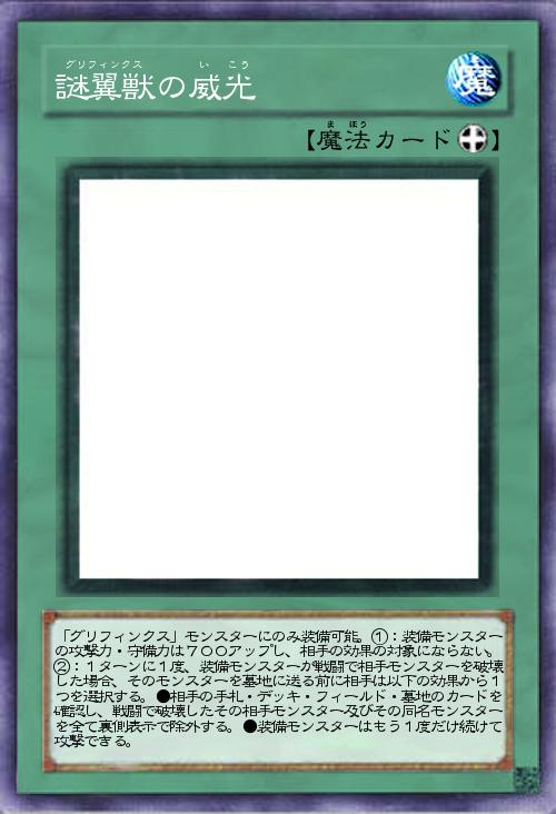 | 「グリフィンクス」モンスターにのみ装備可能。①:装備モンスターの攻撃力・守備力は700アップし、相手の効果の対象にならない。②:1ターンに1度、装備モンスターが戦闘で相手モンスターを破壊した場合、そのモンスターを墓地に送る前に相手は以下の効果から1つを選択する。●相手の手札・デッキ・フィールド・墓地のカードを確認し、戦闘で破壊したその相手モンスター及びその同名モンスターを全て裏側表示で除外する。●装備モンスターはもう1度だけ続けて攻撃できる。 | |||