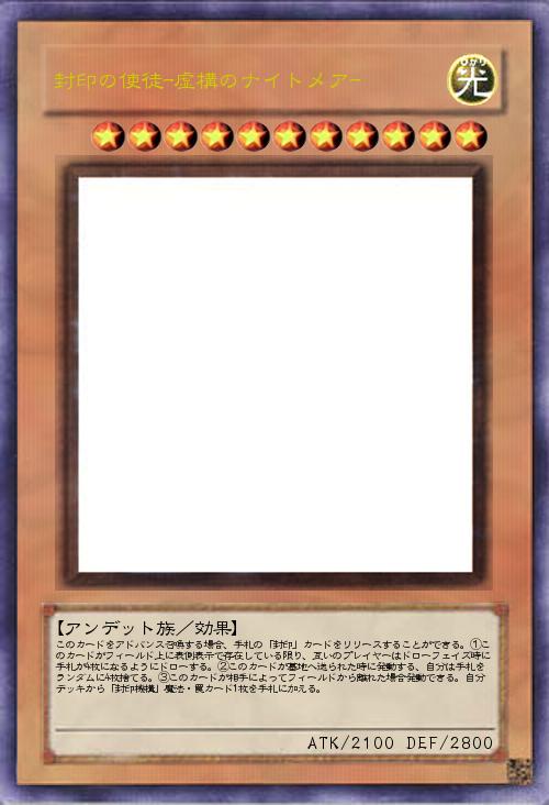 | このカードをアドバンス召喚する場合、手札の「封印」カードをリリースすることができる。①このカードがフィールド上に表側表示で存在している限り、互いのプレイヤーはドローフェイズ時に手札が4枚になるようにドローする。②このカードが墓地へ送られた時に発動する、自分は手札をランダムに4枚捨てる。③このカードが相手によってフィールドから離れた場合発動できる。自分デッキから「封印機構」魔法・罠カード1枚を手札に加える。 | |||