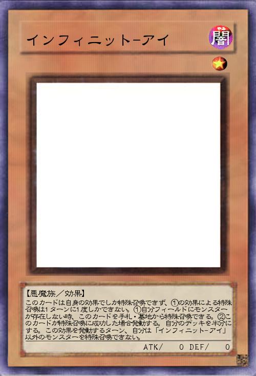 | このカードは自身の効果でしか特殊召喚できず、①の効果による特殊召喚は1ターンに1度しかできない。①自分フィールドにモンスターが存在しない時、このカードを手札・墓地から特殊召喚できる。②このカードが特殊召喚に成功した場合発動する。自分のデッキを半分にする。この効果を発動するターン、自分は「インフィニット-アイ」以外のモンスターを特殊召喚できない。 | |||