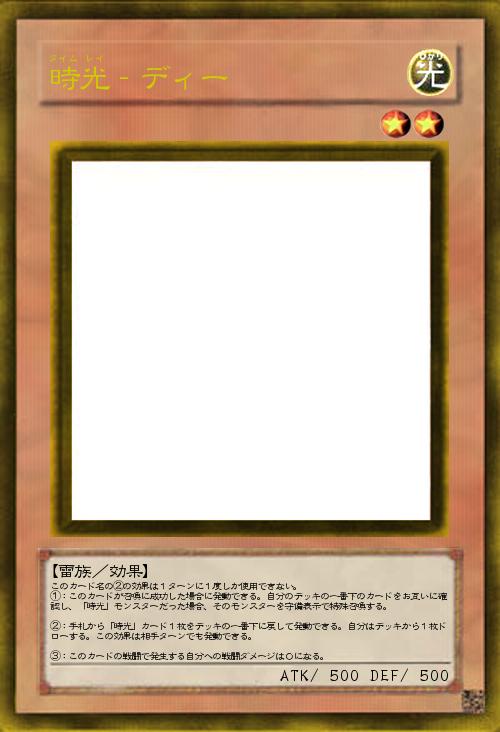 | このカード名の②の効果は1ターンに1度しか使用できない。 ①:このカードが召喚に成功した場合に発動できる。自分のデッキの一番下のカードをお互いに確認し、「時光」モンスターだった場合、そのモンスターを守備表示で特殊召喚する。 ②:手札から「時光」カード1枚をデッキの一番下に戻して発動できる。自分はデッキから1枚ドローする。この効果は相手ターンでも発動できる。 ③:このカードの戦闘で発生する自分への戦闘ダメージは0になる。 | |||