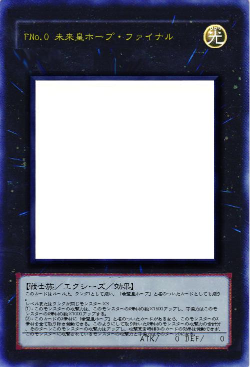 | このカードはルール上、ランク1として扱い、「希望皇ホープ」と名のついたカードとしても扱う。 レベルまたはランクが同じモンスター×3 ①:このモンスターの攻撃力は、このモンスターのX素材の数×1500アップし、守備力はこのモンスターのX素材の数×1000アップする。 ②:このカードのX素材に「希望皇ホープ」と名のついたカードがあるなら、このモンスターのX素材を全て取り除き発動できる。このようにして取り除いたX素材のモンスターの攻撃力の合計分、そのターンこのモンスターの攻撃力はアップし、攻撃宣言時相手のカードの効果は発動できず、このモンスターに攻撃されているモンスターの攻撃力と守備力はそのターン0になる。 | |||