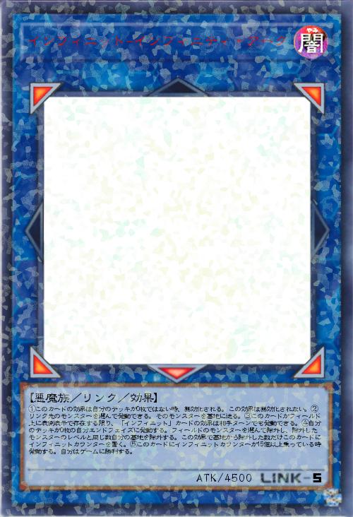 | ①このカードの効果は自分のデッキが0枚ではない時、無効化される。この効果は無効化されない。②リンク先のモンスターを選んで発動できる。そのモンスターを墓地に送る。③このカードがフィールド上に表側表示で存在する限り、「インフィニット」カードの効果は相手ターンでも発動できる。④自分のデッキが0枚の自分エンドフェイズに発動する。フィールドのモンスターを選んで除外し、除外したモンスターのレベルと同じ数自分の墓地を除外する。この効果で墓地から除外した数だけこのカードにインフィニットカウンターを置く。⑤このカードにインフィニットカウンターが15個以上乗っている時発動する。自分はゲームに勝利する。 | |||