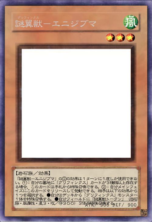 | 「謎翼獣-エニジブマ」の②の効果は1ターンに1度しか使用できない。①:自分の墓地に「グリフィンクス」カードが3種類以上存在する場合、このカードは手札から特殊召喚できる。②:自分メインフェイズにこのカードをリリースして発動できる。相手は以下の効果から1つを選択する。●自分はデッキから「グリフィンクス」モンスター1体を特殊召喚する。●自分フィールドに「謎翼獣トークン」(岩石族・風属性・星3・攻/守300)3体を特殊召喚する。 | |||