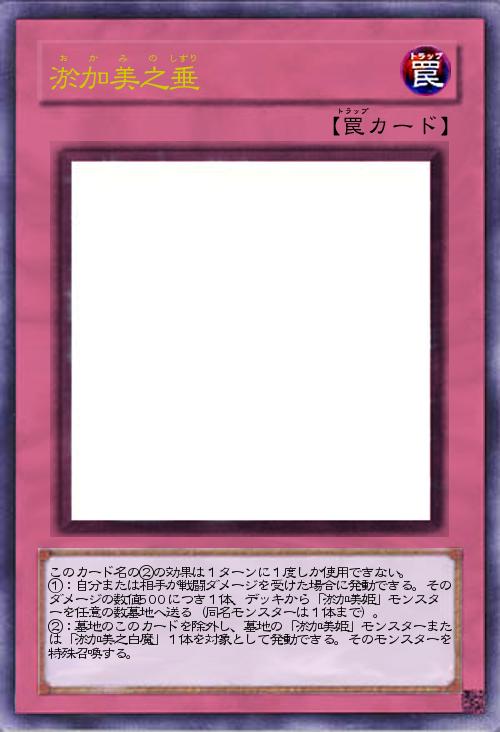 | このカード名の②の効果は1ターンに1度しか使用できない。 ①:自分または相手が戦闘ダメージを受けた場合に発動できる。そのダメージの数値500につき1体、デッキから「淤加美姫」モンスターを任意の数墓地へ送る(同名モンスターは1体まで)。 ②:墓地のこのカードを除外し、墓地の「淤加美姫」モンスターまたは「淤加美之白魔」1体を対象として発動できる。そのモンスターを特殊召喚する。 | |||