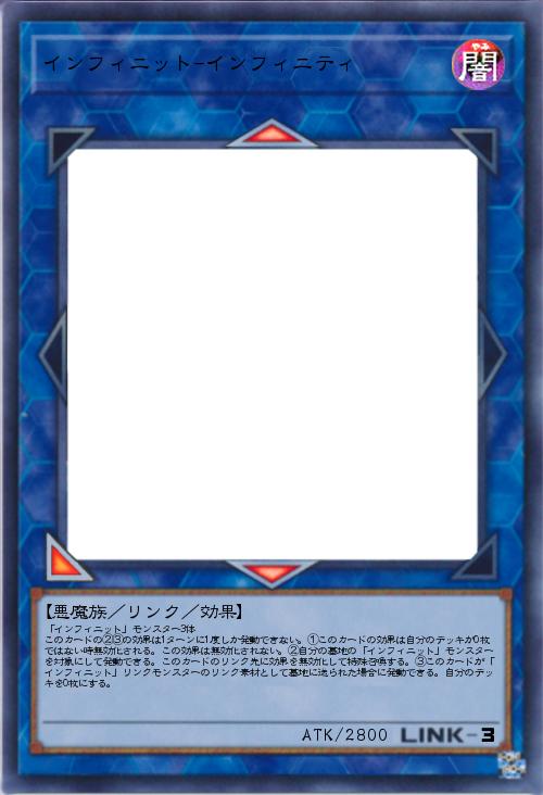 | 「インフィニット」モンスター3体 このカードの②③の効果は1ターンに1度しか発動できない。①このカードの効果は自分のデッキが0枚ではない時無効化される。この効果は無効化されない。②自分の墓地の「インフィニット」モンスターを対象にして発動できる。このカードのリンク先に効果を無効化して特殊召喚する。③このカードが「インフィニット」リンクモンスターのリンク素材として墓地に送られた場合に発動できる。自分のデッキを0枚にする。 | |||
