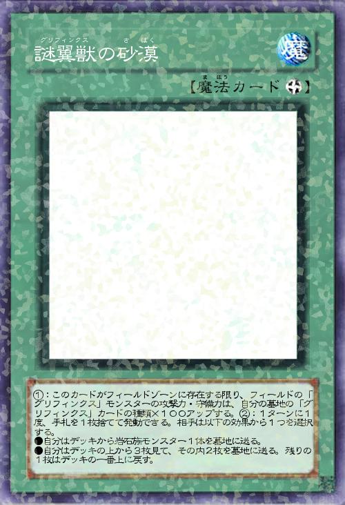 | ①:このカードがフィールドゾーンに存在する限り、フィールドの「グリフィンクス」モンスターの攻撃力・守備力は、自分の墓地の「グリフィンクス」カードの種類×100アップする。②:1ターンに1度、手札を1枚捨てて発動できる。相手は以下の効果から1つを選択する。 ●自分はデッキから岩石族モンスター1体を墓地に送る。 ●自分はデッキの上から3枚見て、その内2枚を墓地に送る。残りの1枚はデッキの一番上に戻す。 | |||