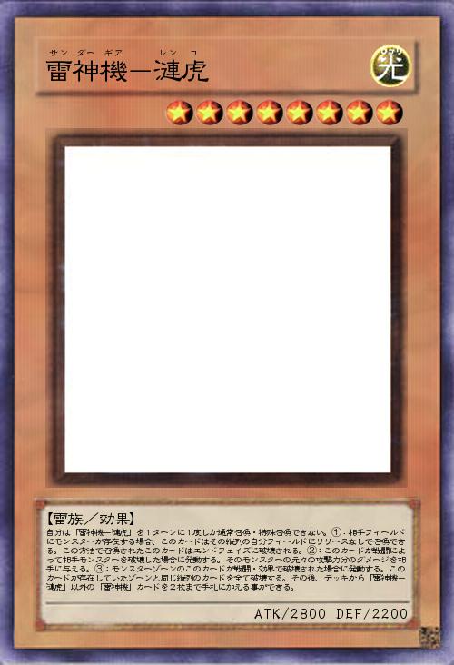 | 自分は「雷神機-漣虎」を1ターンに1度しか通常召喚・特殊召喚できない。①:相手フィールドにモンスターが存在する場合、このカードはその縦列の自分フィールドにリリースなしで召喚できる。この方法で召喚されたこのカードはエンドフェイズに破壊される。②:このカードが戦闘によって相手モンスターを破壊した場合に発動する。そのモンスターの元々の攻撃力分のダメージを相手に与える。③:モンスターゾーンのこのカードが戦闘・効果で破壊された場合に発動する。このカードが存在していたゾーンと同じ縦列のカードを全て破壊する。その後、デッキから「雷神機-漣虎」以外の「雷神機」カードを2枚まで手札に加える事ができる。 | |||