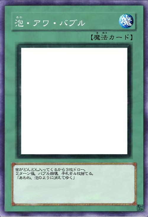 金がどんどん入ってくるから3枚ドロー。 2ターン後、バブル崩壊。手札を4枚捨てる。 「あわわ、泡のように消えてゆく」 |