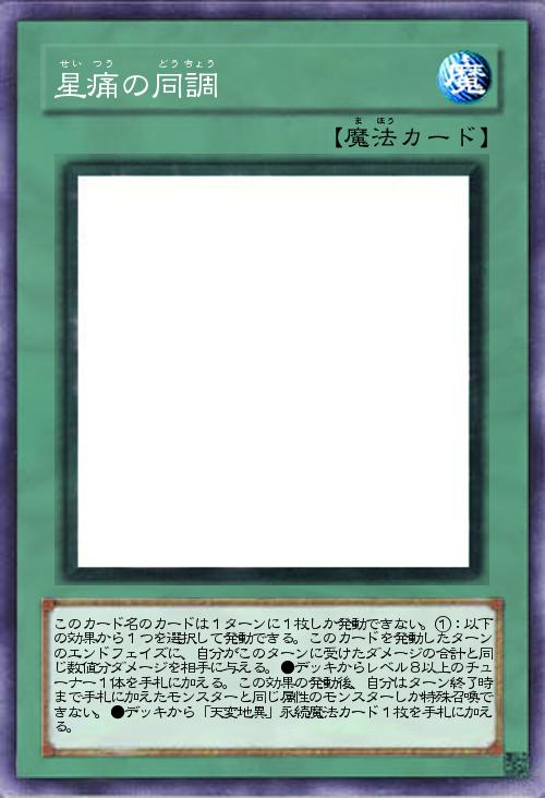 | このカード名のカードは1ターンに1枚しか発動できない。①:以下の効果から1つを選択して発動できる。このカードを発動したターンのエンドフェイズに、自分がこのターンに受けたダメージの合計と同じ数値分ダメージを相手に与える。●デッキからレベル8以上のチューナー1体を手札に加える。この効果の発動後、自分はターン終了時まで手札に加えたモンスターと同じ属性のモンスターしか特殊召喚できない。●デッキから「天変地異」永続魔法カード1枚を手札に加える。 | |||
