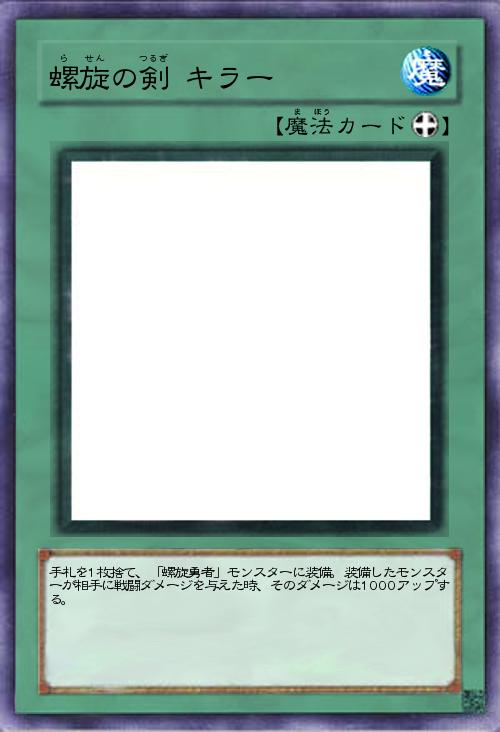| 手札を1枚捨て、「螺旋勇者」モンスターに装備。装備したモンスターが相手に戦闘ダメージを与えた時、そのダメージは1000アップする。 | |||