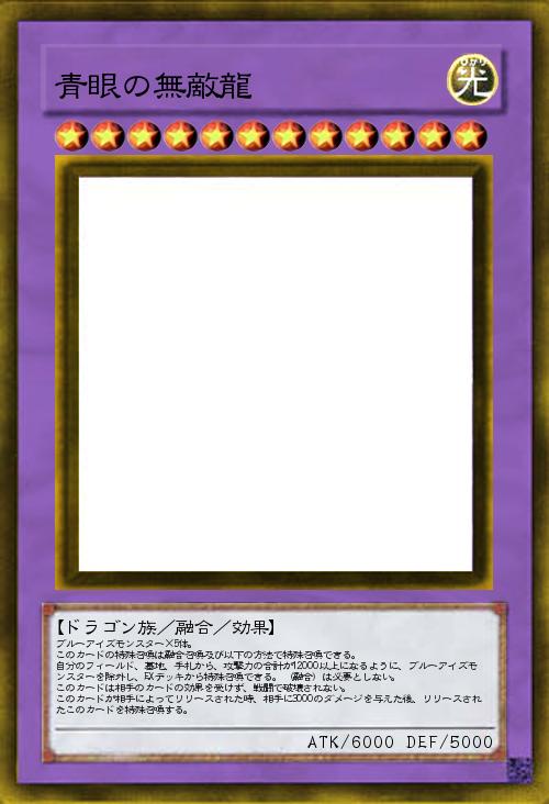 | ブルーアイズモンスター×5体。 このカードの特殊召喚は融合召喚及び以下の方法で特殊召喚できる。 自分のフィールド、墓地、手札から、攻撃力の合計が12000以上になるように、ブルーアイズモンスターを除外し、EXデッキから特殊召喚できる。(融合)は必要としない。 このカードは相手のカードの効果を受けず、戦闘で破壊されない。 このカードが相手によってリリースされた時、相手に3000のダメージを与えた後、リリースされたこのカードを特殊召喚する。 | |||