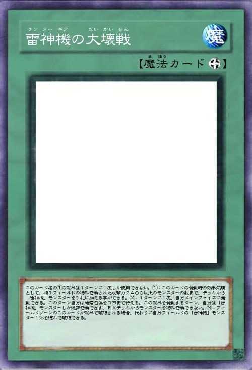 | このカード名の①の効果は1ターンに1度しか使用できない。①:このカードの発動時の効果処理として、相手フィールドの特殊召喚された攻撃力2400以上のモンスターの数まで、デッキから「雷神機」モンスターを手札に加える事ができる。②:1ターンに1度、自分メインフェイズに発動できる。このターン自分は通常召喚を3回まで行える。この効果を発動するターン、自分は「雷神機」モンスターしか通常召喚できず、EXデッキからモンスターを特殊召喚できない。③:フィールドゾーンのこのカードが効果で破壊される場合、代わりに自分フィールドの「雷神機」モンスター1体を選んで破壊できる。 | |||