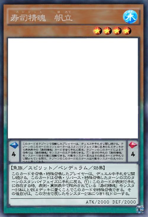 約2週間ぶりの寿司です。思わず「これはひどい」と言ってしまうような効果にしました。とはいえモンスター効果は除外関連ですので、寿司デッキが普通に回っている分にはあまり使われない効果となりそうですが。