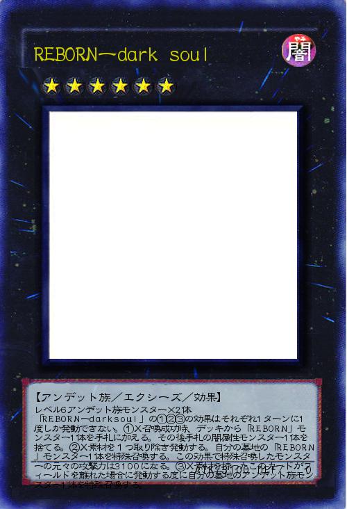 | レベル6アンデット族モンスター×2体 「REBORNーdarksoul」の①②③の効果はそれぞれ1ターンに1度しか発動できない。①X召喚成功時、デッキから「REBORN」モンスター1体を手札に加える。その後手札の闇属性モンスター1体を捨てる。②X素材を1つ取り除き発動する。自分の墓地の「REBORN」モンスター1体を特殊召喚する。この効果で特殊召喚したモンスターの元々の攻撃力は3100になる。③X素材を持ったこのカードがフィールドを離れた場合に発動する度に自分の墓地のアンデット族モンスター1体を特殊召喚する。 | |||