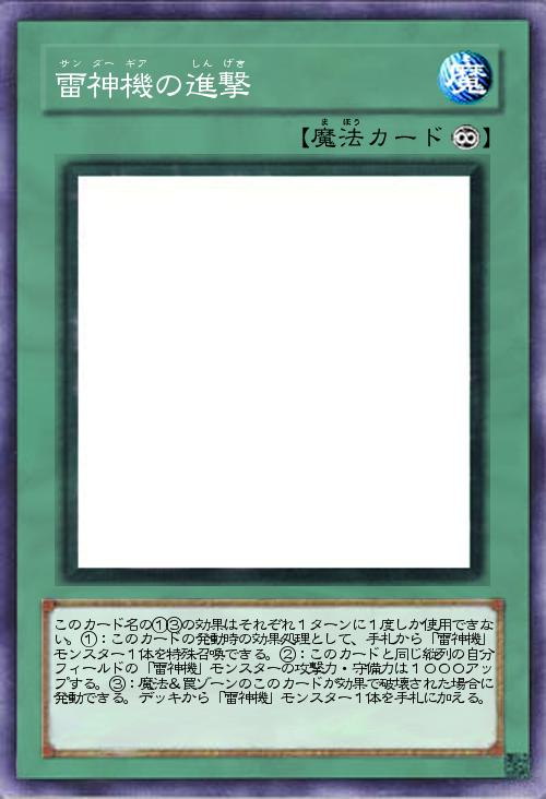 | このカード名の①③の効果はそれぞれ1ターンに1度しか使用できない。①:このカードの発動時の効果処理として、手札から「雷神機」モンスター1体を特殊召喚できる。②:このカードと同じ縦列の自分フィールドの「雷神機」モンスターの攻撃力・守備力は1000アップする。③:魔法&罠ゾーンのこのカードが効果で破壊された場合に発動できる。デッキから「雷神機」モンスター1体を手札に加える。 | |||