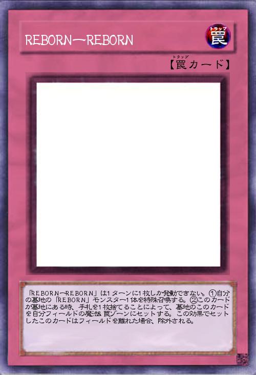 | 「REBORNーREBORN」は1ターンに1枚しか発動できない。①自分の墓地の「REBORN」モンスター1体を特殊召喚する。②このカードが墓地にある時、手札を1枚捨てることによって、墓地のこのカードを自分フィールドの魔法&罠ゾーンにセットする。この効果でセットしたこのカードはフィールドを離れた場合、除外される。 | |||