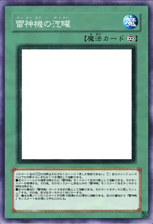 | このカード名の①②の効果はそれぞれ1ターンに1度しか使用できない。①:自分メインフェイズに以下の効果からいずれか1つを選択して発動できる。 ●自分フィールドの通常召喚された「雷神機」モンスター1体を対象として発動できる。そのモンスターを破壊する。その後、そのモンスターと同名以外の「雷神機」モンスター1体をデッキから特殊召喚する。 ●自分の墓地の「雷神機」カード3枚を対象として発動できる。そのカードをデッキに戻してシャッフする。その後、自分はデッキから1枚ドローする。 ②:魔法&罠ゾーンのこのカードが効果で破壊された場合に発動できる。自分の墓地から「雷神機」モンスター1体を選んで手札に加える。 | |||