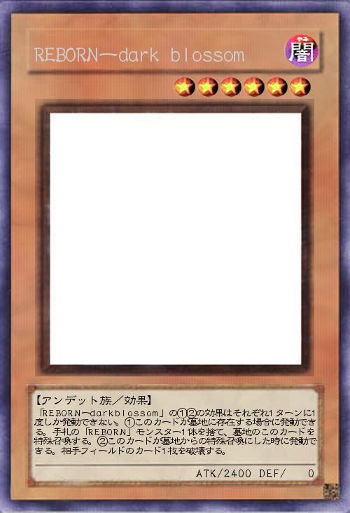 | 「REBORNーdarkblossom」の①②の効果はそれぞれ1ターンに1度しか発動できない。①このカードが墓地に存在する場合に発動できる。手札の「REBORN」モンスター1体を捨て、墓地のこのカードを特殊召喚する。②このカードが墓地からの特殊召喚にした時に発動できる。相手フィールドのカード1枚を破壊する。 | |||